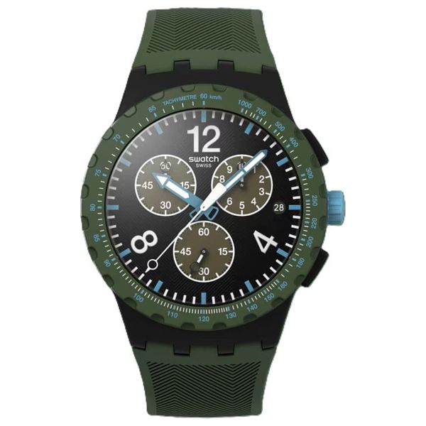 تتميز بقرص أسود واضح مع أرقام بيضاء ومسار دقائق أزرق/أبيض، ومؤشرات مضيئة في الظلام. تتناغم المقاييس الفرعية الخضراء الداكنة مع العلبة المطفية السوداء، ويكمل الحزام السيليكون الأخضر الإطلالة. توجد نافذة التاريخ عند الثالثة، وعلبة بوليمر 42 مم مع مشبك بنقرة. مقاومة للماء حتى 3 بار