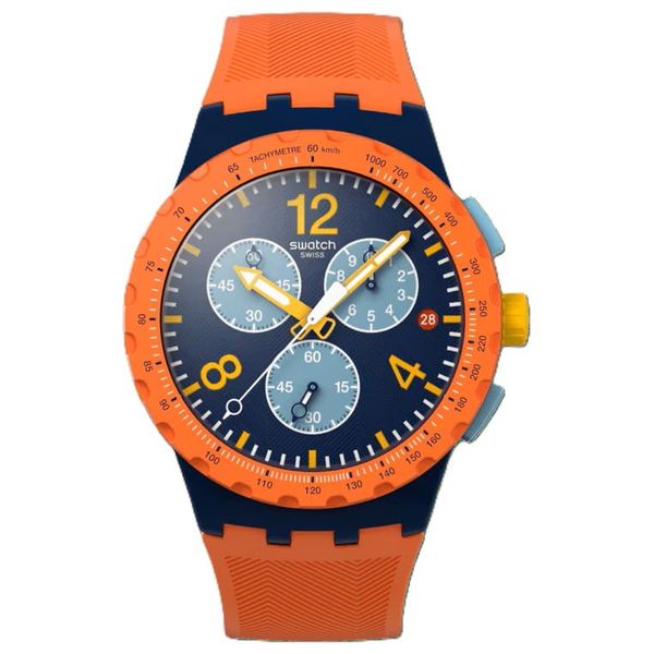 ساعة كرونوغرافة بشاشة زرقاء منسقة مع أعداد صفراء ومؤشرات فرعية زرقاء فاتحة تلمع في الظلام. إطار برتقالي لافت وسوار سيليكون، وحالة بوليمر بقطر 42 مم مع حركة كوارتز ومقاومة للماء حتى 3 بار