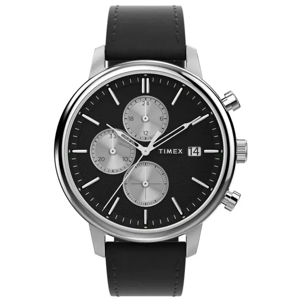 ساعة رجالية تيمكس بعلبة دائرية من النحاس بقطر 45 مم وسمك 11 مم، مع ميناء أسود وزجاج معدني. السوار من الجلد الأسود بعرض 20 مم. مقاومة الماء حتى 50 متر وحركة الساعة كوارتز