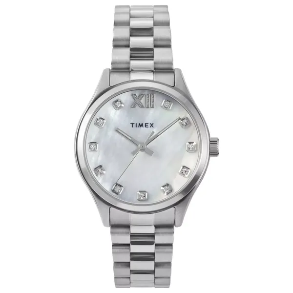 ساعة تايمكس نسائية تجمع بين قرص لؤلؤي وبريق سوار من الستانلس ستيل فضي، مع حركة كوارتز ومقاومة للماء حتى 50 متر