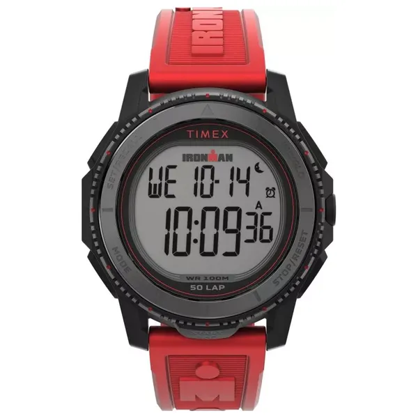 ساعة تيمكس رجالية بعرض 47 مم وعلبة دائرية مصنوعة من مادة صناعية بسماكة 11 مم. حركة كوارتز رقمية، زجاج أكريليك. مقاومة الماء حتى 100 متر. السوار من المطاط باللون الأحمر بعرض 20 مم