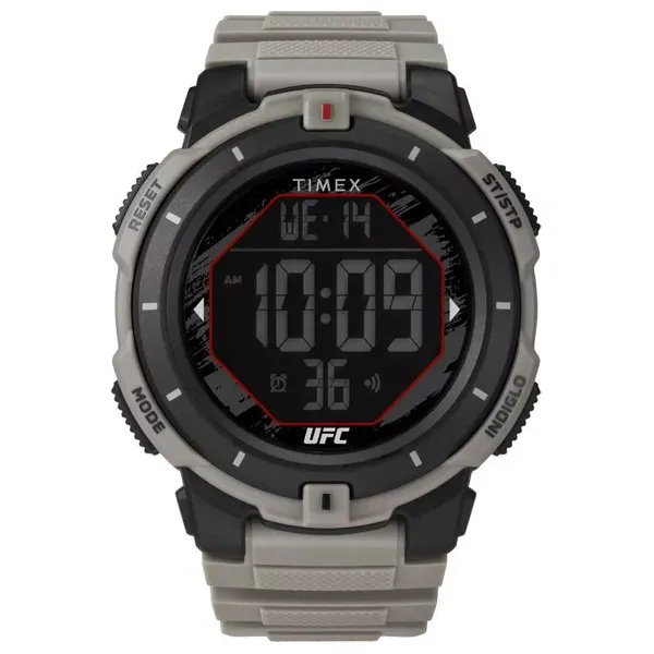 ساعة بعقارب رقمية مقاومة للماء حتى 100 متر، بحافظة دائرية مصنوعة من مادة صناعية بقطر 48 مم وسمك 10 مم. تأتي بشاشة عرض وغطاء من الأكريليك، مع سوار رملي من المطاط بعرض 20 مم