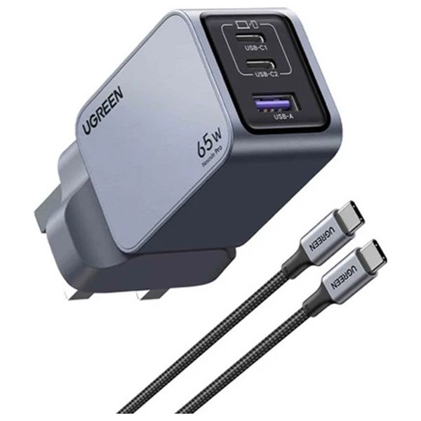 شاحن يوجرين نيكسود برو 65 وات بثلاثة منافذ GaN يوفر حتى 65 وات إجمالاً من منفذي USB-C ومنفذ USB-A واحد. يقبل دخل 100-240 فولت لاستخدام عالمي ويدعم الشحن السريع لأجهزة اللابتوب والهواتف والتابلت، مثالي للسفر والمكتب والمنزل في العراق.