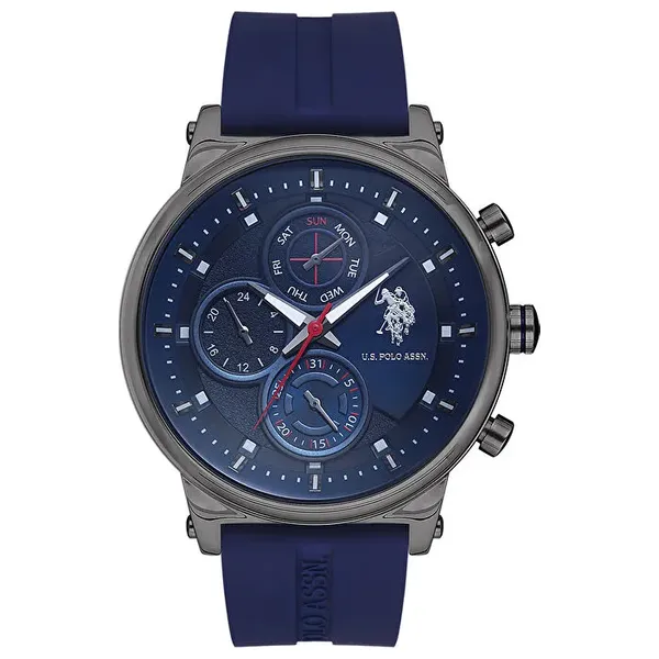 ساعة رجالية بتصميم رياضي، مع علبة دائرية من الفولاذ باللون المدخن بحجم 46 ملم وسمك 13 ملم، وقرص أزرق كحلي تناظري، تعمل الساعة بحركة كوارتز، ومقاومة للماء حتى 5 ATM، السوار سيليكون أزرق كحلي، بعرض 22 ملم وطول 20 سم، تشمل الوظائف عرض 24 ساعة واليوم والتقويم، الوزن 130 غم