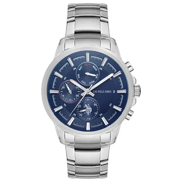 ساعة رجالية بتصميم رياضي، مع علبة دائرية من الفولاذ باللون الرمادي المعدني بحجم 44 ملم وسمك 12 ملم، وقرص أزرق كحلي تناظري، تعمل الساعة بحركة كوارتز، ومقاومة للماء حتى 5 ATM، السوار من الفولاذ باللون الرمادي المعدني بعرض 22 ملم وطول 20 سم، تشمل الوظائف عرض 24 ساعة واليوم والتقويم، الوزن 80 غم