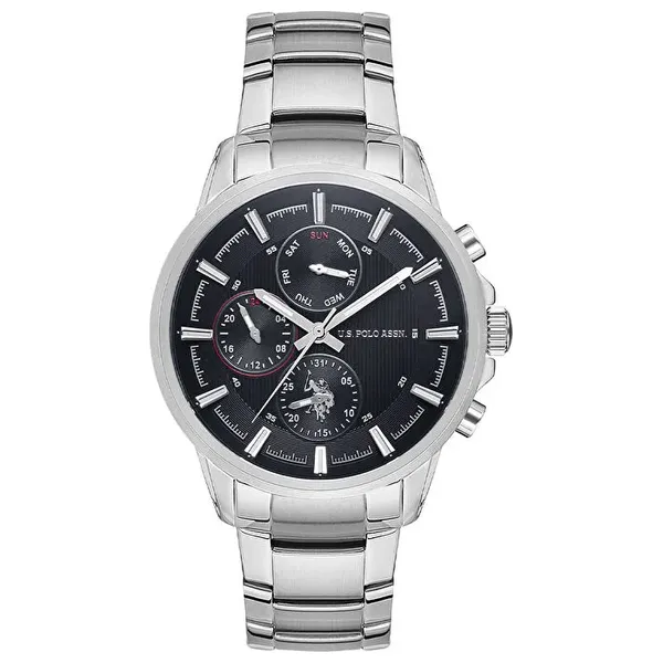 ساعة رجالية بتصميم رياضي، مع علبة دائرية من الفولاذ باللون الرمادي المعدني بحجم 44 ملم وسمك 12 ملم، وقرص أسود تناظري، تعمل الساعة بحركة كوارتز، ومقاومة للماء حتى 5 ATM، السوار من الفولاذ باللون الرمادي المعدني بعرض 22 ملم وطول 20 سم، تشمل الوظائف عرض 24 ساعة واليوم والتقويم، الوزن 80 غم