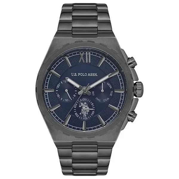 ساعة رجالية تأتي بعلبة دائرية من الفولاذ باللون الدخاني بحجم 45 ملم وسمك 13 ملم، مع قرص أزرق تناظري محمي بزجاج معدني مقاوم للخدش، تعمل الساعة بحركة كوارتز دقيقة وتتميز بمقاومة للماء حتى 5 ATM، السوار مصنوع من الفولاذ باللون الدخاني بطول 20 سم وعرض 26×20 ملم، تشمل الوظائف عرض اليوم والتاريخ، وتزن الساعة 180 غم
