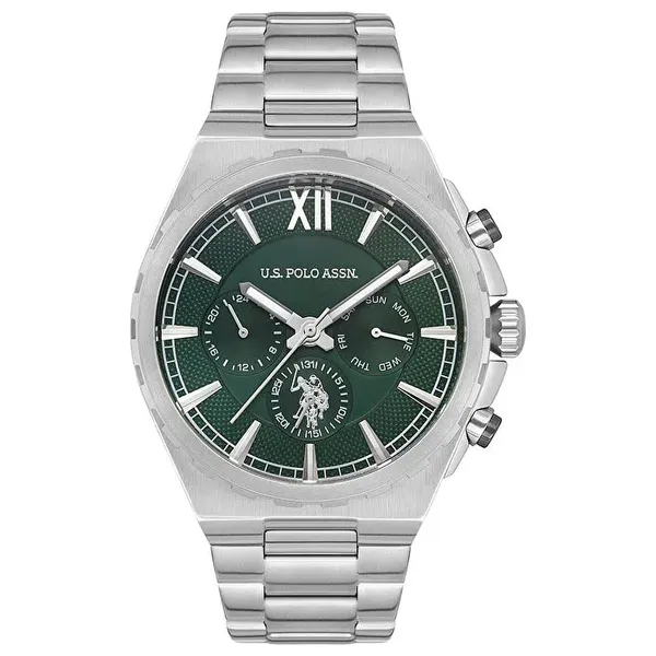 ساعة رجالية تأتي بعلبة دائرية من الفولاذ باللون الرمادي المعدني بحجم 45 ملم وسمك 13 ملم، مع قرص أخضر تناظري، تعمل الساعة بحركة كوارتز دقيقة، وتتميز بمقاومة للماء حتى 5 ATM، السوار مصنوع من الفولاذ باللون الرمادي المعدني بطول 20 سم وعرض 26×20 ملم، تشمل الوظائف عرض 24 ساعة واليوم والتقويم، يبلغ وزن الساعة 180 غم