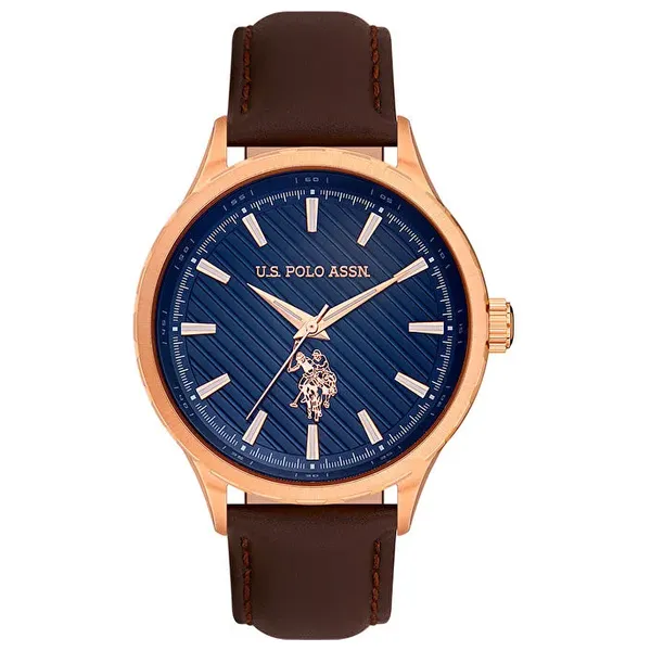 ساعة رجالية بتصميم كلاسيكي، مع علبة دائرية من الفولاذ باللون الذهبي الوردي بحجم 42 ملم وسمك 11 ملم، وقرص أزرق تناظري، تعمل الساعة بحركة كوارتز، ومقاومة الماء حتى 5 ATM، السوار جلدي بني من جلد العجل بعرض 20×18 ملم وطول 20 سم، الوزن 53 غم