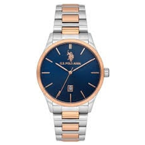 ساعة رجالية بتصميم كلاسيكي، تتميز الساعة بعلبة 42 ملم وسمك 10 مم من الفولاذ باللون الرمادي المعدني، مع قرص أزرق تناظري وسوار فولاذي باللون الرمادي المعدني مع لمسات من الذهب الوردي، تعمل الساعة بحركة كوارتز، ومقاومة الماء حتى 5 ATM، تشمل وظائف التقويم