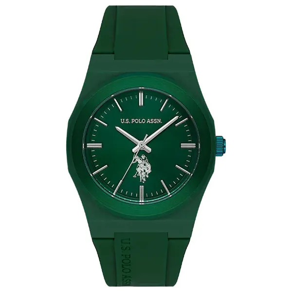 ساعة رجالية بتصميم رياضي، تعمل بآلية كوارتز دقيقة، وتأتي بعلبة دائرية من البلاستيك باللون الأخضر بقطر 40 مم وسماكة 8 مم، تتميز بزجاج معدني وميناء أخضر، إضافةً إلى سوار سيليكون أخضر بطول 20 سم وعرض 27×20 مم. الساعة مقاومة للماء حتى 3 ATM