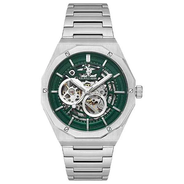 ساعة رجالية بتصميم كلاسيكي أنيق، تعمل بآلية أوتوماتيكية، وتأتي بعلبة دائرية من الفولاذ باللون الرمادي المعدني بقطر 42 مم وسماكة 12 مم. تتميز بزجاج معدني وميناء أخضر، إضافةً إلى سوار فولاذي رمادي معدني بطول 18 سم وعرض 24×18 مم. الساعة مقاومة للماء حتى 50 مترأ