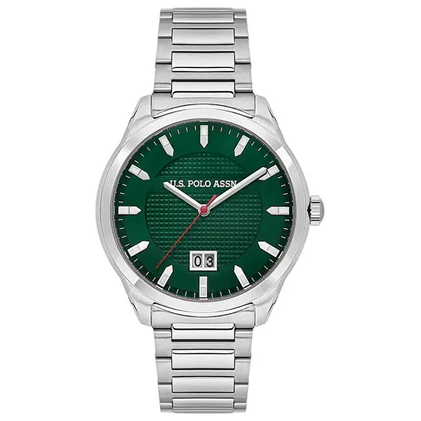 ساعة رجالية بتصميم كلاسيكي أنيق، تعمل بآلية كوارتز دقيقة، وتأتي بعلبة دائرية من الفولاذ باللون الرمادي المعدني بقطر 42 مم وسماكة 11 مم. تتميز بزجاج معدني وميناء أخضر، إضافةً إلى سوار فولاذي رمادي معدني بطول 20 سم وعرض 20×18 مم. الساعة مقاومة للماء حتى 50 متر، وتحتوي على تقويم يومي