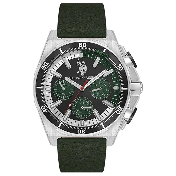 ساعة رجالية بتصميم رياضي أنيق، تعمل بآلية كوارتز دقيقة، وتأتي بعلبة دائرية من الفولاذ باللون الرمادي المعدني بقطر 44 مم وسماكة 12 مم. تتميز بزجاج معدني وميناء أسود، إضافةً إلى سوار جلد عجل أخضر بطول 20 سم وعرض 22 مم. الساعة مقاومة للماء حتى 50 متر، وتحتوي على تقويم يومي ووظيفة عرض 24 ساعة