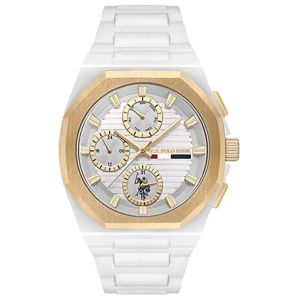 ساعةرجالية بتصميم رياضي أنيق، تعمل بآلية كوارتز دقيقة، وتأتي بعلبة دائرية من البلاستيك باللون الأبيض بقطر 42 مم وسماكة 12 مم. تتميز بزجاج معدني وميناء أبيض، إضافةً إلى سوار سيليكون أبيض بطول 20 سم وعرض 28×20 مم. الساعة مقاومة للماء حتى 30 متر، وتحتوي على تقويم يومي ووظيفة عرض 24 ساعة