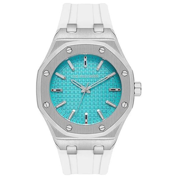 ساعة من يو اس بولو اسن، تتميز بقرص تركواز، هيكل فولاذي 42 مم، وسوار سيليكون أبيض