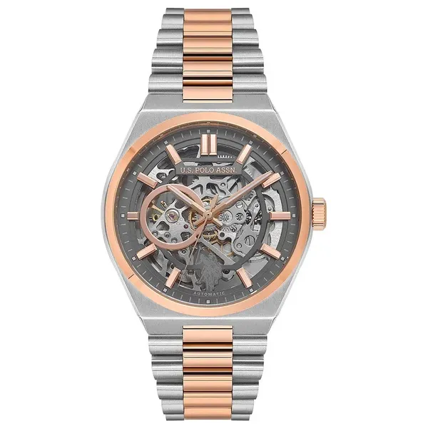ساعة رجالية بتصميم كلاسيكي أنيق، تعمل بآلية أوتوماتيكية، وتأتي بعلبة دائرية من الفولاذ باللون الرمادي المعدني بقطر 42 مم وسماكة 13 مم. تتميز بزجاج معدني وميناء رمادي بتصميم شفاف جزئيًا، إضافةً إلى سوار فولاذي باللون الذهبي/رمادي معدني بطول 20 سم وعرض 12 مم. الساعة مقاومة للماء حتى 50 متر