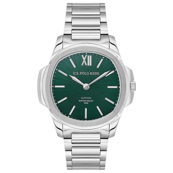 ساعة يد رجالية كلاسيكية من يو إس بولو أسن، تتميز بقرص أخضر وسوار من الفولاذ وزجاج سافير وحركة كوارتز