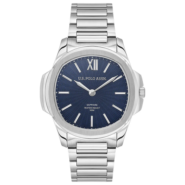 ساعة رجالية بتصميم كلاسيكي أنيق، تعمل بآلية كوارتز دقيقة، وتأتي بعلبة دائرية من الفولاذ باللون الرمادي المعدني بقطر 42×50 مم وسماكة 7 مم. تتميز بزجاج ياقوتي شبه شفاف وميناء أزرق، إضافةً إلى سوار فولاذي رمادي معدني بطول 20 سم وعرض 22×20 مم. الساعة مقاومة للماء حتى 50 متر