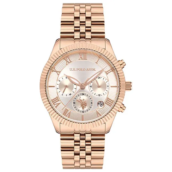 ساعة نسائية بتصميم كلاسيكي أنيق، تعمل بآلية كوارتز دقيقة، وتأتي بعلبة دائرية من الفولاذ باللون الذهبي الوردي بقطر 38 مم وسماكة 10 مم. تتميز بزجاج معدني وميناء ذهبي وردي، إضافةً إلى سوار فولاذي ذهبي وردي بطول 17 سم وعرض 20×18 مم. الساعة مقاومة للماء حتى 50 متر، وتحتوي على تقويم يومي ووظيفة عرض 24 ساعة