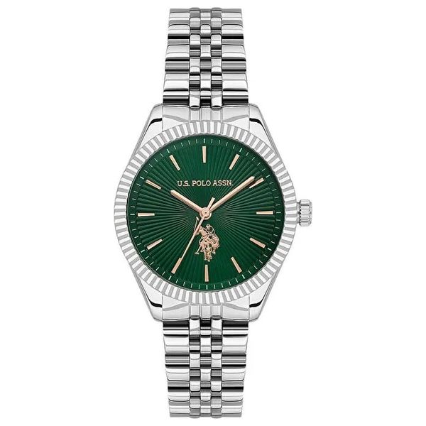 ساعة نسائية من يو اس بولو اسن بتصميم كلاسيكي وقرص أخضر أنيق، مع علبة وميناء من الفولاذ وسوار معدني أنيق
