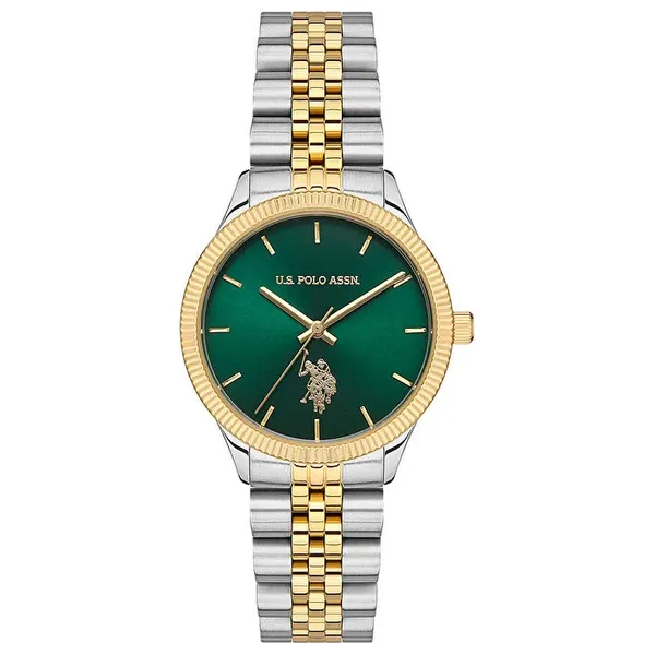ساعة نسائية الكلاسيكية، تعمل بآلية كوارتز، بعلبة دائرية من الفولاذ باللون الرمادي المعدني بقطر 32 مم وسماكة 9 مم. الميناء أخضر، والسوار فولاذي مزدوج اللون (ذهبي/رمادي معدني) بطول 19 سم وعرض 16×14 مم. مقاومة الماء تصل إلى 50 متر