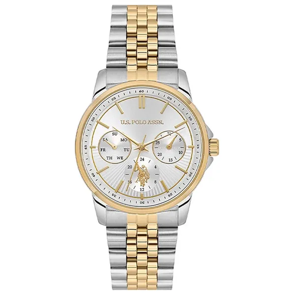ساعة نسائية بعرض 34 مم وسماكة قياسية، بعلبة دائرية من الفولاذ باللون الفضي. الميناء فضي من نوع تناظري مع تقويم متوفر، السوار فولاذي باللون الذهبي، مقاومة الماء 50 متر، وآلية التشغيل بطارية كوارتز