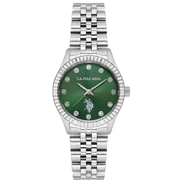 تتميز الساعة بميناء أخضر دائري مزين بحجر، وهيكل فولاذي رمادي معدني بقطر 30 مم وسمك 8 مم، مع سوار معدني رمادي بعرض 16 × 13 مم وطول 18 سم، تعمل الساعة بآلية كوارتز دقيقة، وتتمتع بمقاومة للماء حتى 30 متر، وزن الساعة 80 غرامًا