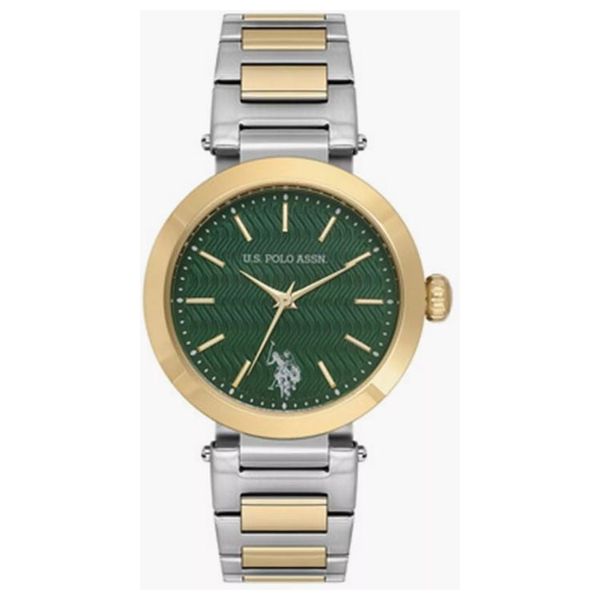 قرص أخضر مقاس 34 مم مع سوار من الفولاذ ذو اللونين الفضّي والذهبي يمنحك مظهراً كلاسيكياً، العرض التناظري بسيط وواضح مع إبزيم مخفي آمن، مقاومة الماء حتى 50 متر