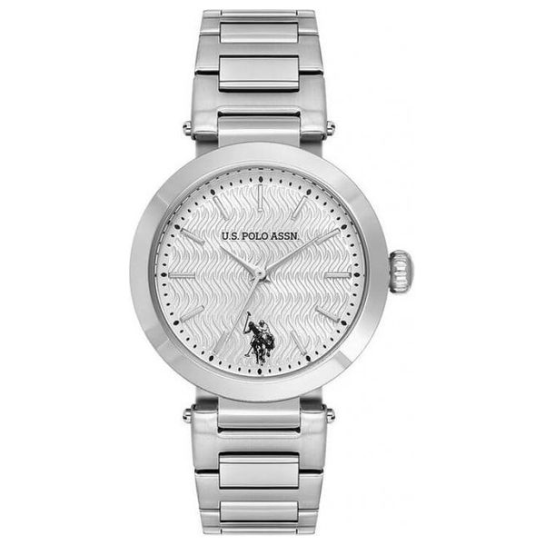 ساعة نسائية كلاسيكية من يو إس بولو أسن المصنوعة من الفولاذ المقاوم للصدأ، تتميز بعلبة 34 مم، ومظهر فضي للسوار والهيكل، زجاج معدني، حركة كوارتز، ومقاومة للماء حتى 3 بار