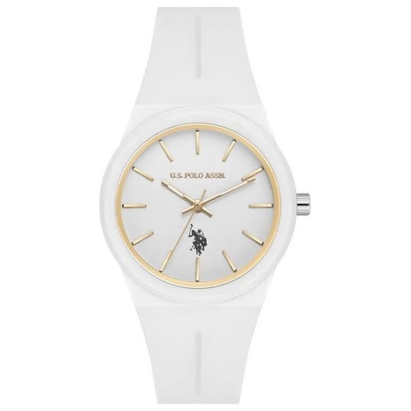 ساعة نسائية أنيقة من يو إس بولو أسن بلون أبيض مع علبة سيليكون بقطر 35 مم وقرص أبيض، شاشة التناظر تعرض عقارب ومؤشرات ذهبية اللون، وتثبت على حزام سيليكون أبيض. تعمل بحركة كوارتز ومزوّدة بزجاج معدني