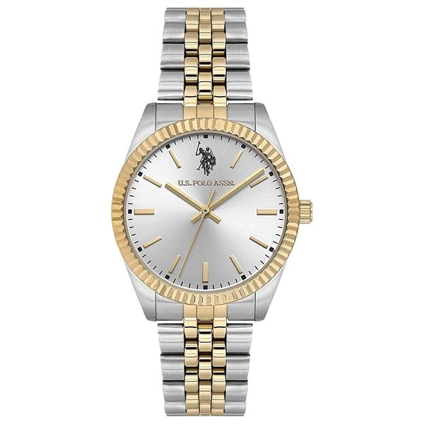 ساعة نسائية من يو إس بولو أسن تجمع بين الأناقة الخالدة والعملية اليومية، هيكل و سوار من الفولاذ ثنائي اللون يحيطان بميناء فضي مع لمسات ذهبية، يحمي الزجاج المعدني الميناء، وتوفر حركة كوارتز دقيقة عرض الوقت بدقة، بقطر علَبة 34 مم وسمك 8 مم