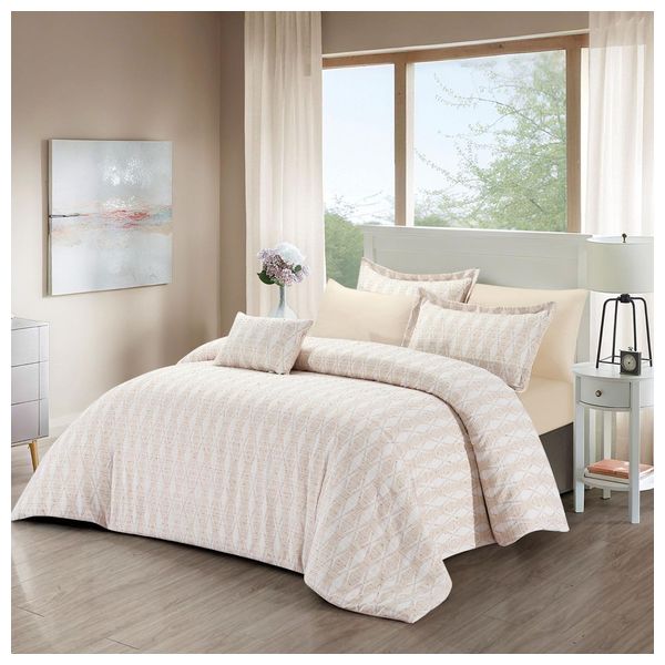 طقم لحاف فالنتيني كينغ 7 قطع، يشمل لحاف 260×230 سم، ملاية 200×200+30 سم، مخدتان زخرفيتان 50×75+5 سم، 2 أغطية مخدات 50×75 سم، ووسادة طولية 35×50 سم