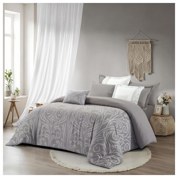 طقم لحاف فالنتيني يشمل لحاف 260×230 سم، ملاية سرير 200×200+30 سم، مخدتان زخرفيتان 50×75+5 سم، 2 أغطية مخدات 50×75 سم، ومخدة مستطيلة 35×50 سم محشوة