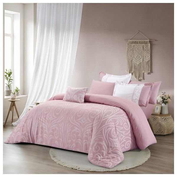 طقم لحاف فالنتيني يشمل لحاف 260×230 سم، ملاية سرير 200×200+30 سم، مخدتان زخرفيتان 50×75+5 سم، 2 أغطية مخدات 50×75 سم، ومخدة مستطيلة 35×50 سم محشوة