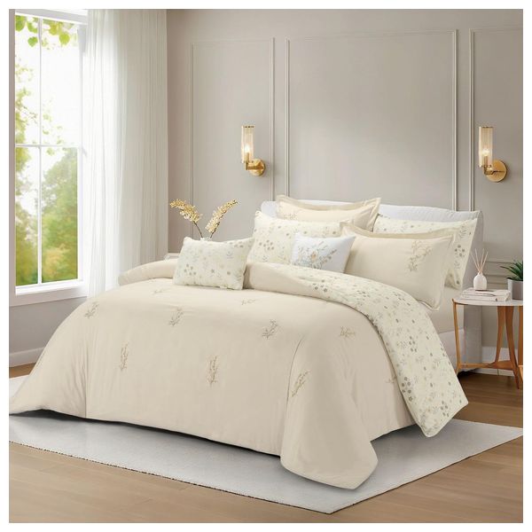 يشمل لحاف 260×230 سم، ملاية مرتبة 200×200+30 سم، غطاءان مخدات 50×75+5 سم، أغطية وسائد 50×75 سم، مخدة زخرفية 45×45 سم، ومخدة طولية 35×50 سم