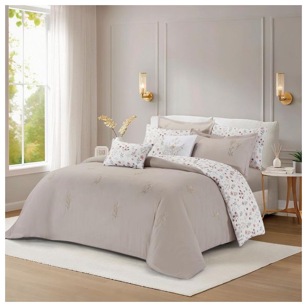 يشمل لحاف 260×230 سم، ملاية مرتبة 200×200+30 سم، غطاءان مخدات 50×75+5 سم، أغطية وسائد 50×75 سم، مخدة زخرفية 45×45 سم، ومخدة طولية 35×50 سم