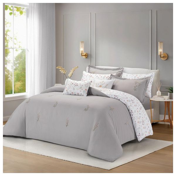 يشمل لحاف 260×230 سم، ملاية مرتبة 200×200+30 سم، غطاءان مخدات 50×75+5 سم، أغطية وسائد 50×75 سم، مخدة زخرفية 45×45 سم، ومخدة طولية 35×50 سم