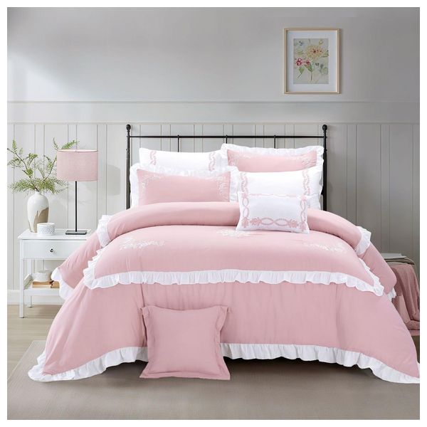 طقم لحاف فالنتيني من ميكروفايبر ناعم مع تطريز رقمي وكشكشة أنيقة، يشمل لحاف 260×230 سم، ملاية 200×200+30 سم، أغطية وسائد 50×75+5 سم، أغطية مخدات 50×75 سم، غطاء وسادة 45×45 سم، ووسادة طولية 35×50 سم