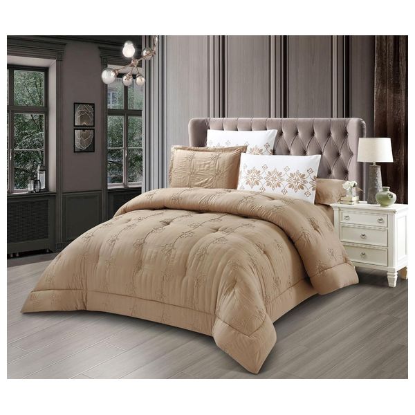 طقم بطانية من فالنتيني، 6 قطع بميكروفايبر ناعم وتطريز، يضم بطانية كبيرة 240×260 سم بوزن 300 GSM، ملاءة مثبتة 200×200+35 سم، و4 أغطية مخدات بقياس 50×75 سم (2 منها مع حواف +5 سم)
