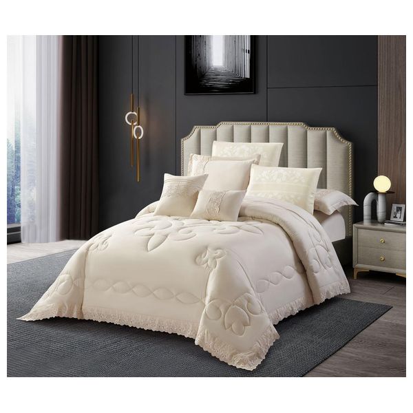 طقم لحاف كينغ من فالنتيني موديل Stella White، مكوّن من 8 قطع، يشمل لحاف 260×240 سم، ملاءة 200×200+30 سم، غطاء مخدة 50×75 سم، مخدتين 50×75+5 سم، ومخدتين مزخرفتين 45×45 و35×45 سم مملوءتين