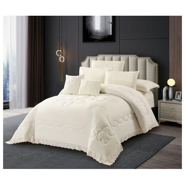 طقم لحاف كينغ من فالنتيني موديل Stella White، مكوّن من 8 قطع، يشمل لحاف 260×240 سم، ملاءة 200×200+30 سم، غطاء مخدة 50×75 سم، مخدتين 50×75+5 سم، ومخدتين مزخرفتين 45×45 و35×45 سم مملوءتين