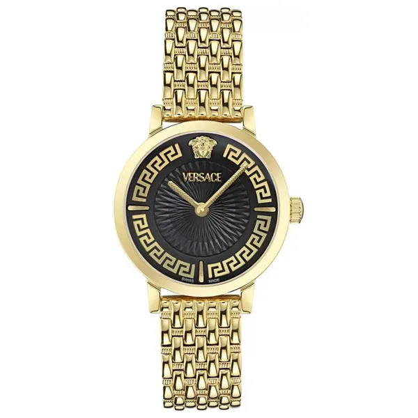 ساعة سويسرية الصنع بتصميم فاخر يجمع بين الأصالة والحداثة، مع علبة 35 مم وسوار بلونين ذهبي وفضي وقرص أخضر بنقشة غيّوش وشعار ميدوسا ثلاثي الأبعاد عند الساعة 12، تعمل بآلية كوارتز دقيقة، مقاومة للماء حتى 5 ATM، وتأتي مع إبزيم قابل للطي