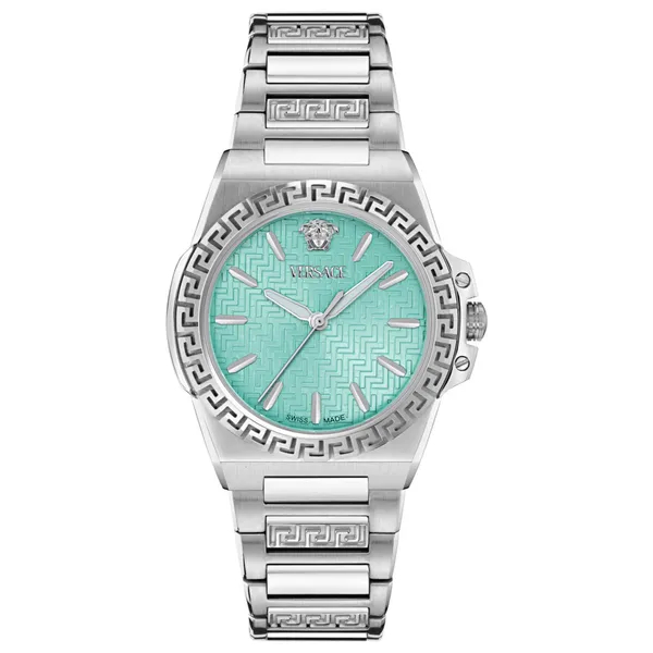 ساعة بتصميم أنيق وعصري للمرأة الحديثة، مع علبة 38 مم من الفولاذ المقاوم للصدأ وسوار فولاذي، وقرص أزرق فاتح بنقشة غيّوش فاخرة، يتميز الإطار العلوي بنقوش La Greca وحروف Versace المميزة، تعمل بآلية كوارتز سويسرية ثلاثية العقارب، مقاومة للماء حتى 5 ATM، مع إبزيم قابل للطي