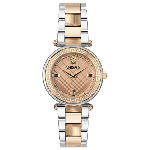 ساعة نسائية بتصميم أيقوني، يتميز القرص بتأثير Matelassé، بينما يزين الحلقة العلوية نقوش Greca المينا، مع شعار Medusa على الحلقة المعدنية، تأتي الساعة بعلبة 35 ملم ثنائية اللون وسوار ثنائي اللون، تعمل بآلية كوارتز سويسرية بعقربين، مقاومة للماء حتى 5 ATM، ومزودة بإبزيم قابل للطي