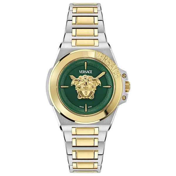 ساعة نسائية من فيرساتشي هيرا بتصميم فاخر، مع علبة 37 ملم من الفولاذ المقاوم للصدأ باللون الفضي وسوار ثنائي اللون من الفولاذ المقاوم للصدأ، يتميز القرص باللون الأخضر ويعمل بحركة كوارتز سويسرية تعمل بالبطارية، مع زجاج مقاوم للخدش من نوع ياقوت صناعي، مقاومة الماء حتى 50 مترًا، ومزودة بإبزيم قابل للفتح بزر الضغط