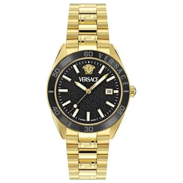 ساعة رجالية من فيرساتشي، تتميز الساعة بسوار وعلبة ذهبيتين من الفولاذ المقاوم للصدأ عالي الجودة، تتناغم مع قرص أسود أنيق يحمل شعار Versace الذهبي، مزودة بإبزيم فراشة مع ميزات أمان إضافية لضمان الراحة والسلامة عند ارتدائها، تعمل الساعة بحركة كوارتز سويسرية ومحمية بزجاج ياقوت مقاوم للخدش، تشمل الوظائف عرض التاريخ ومقاومة الماء حتى 50 مترًا
