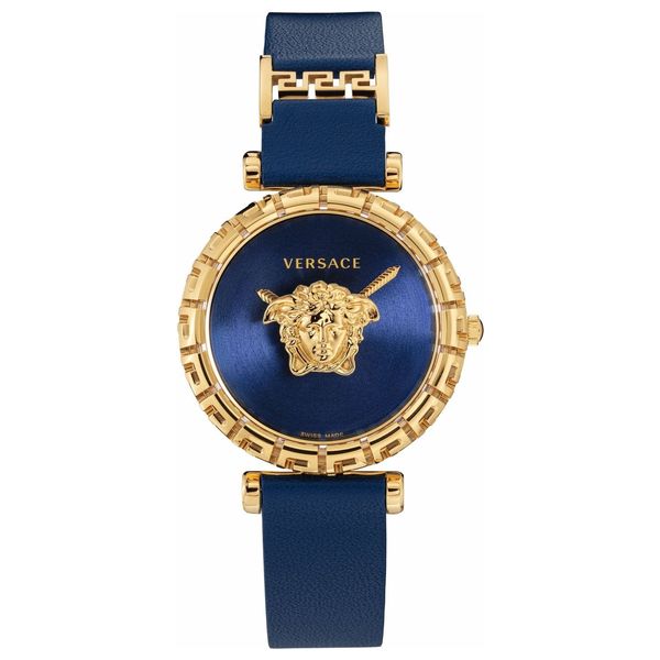 ساعة نسائية تجمع بين الأناقة والفخامة، تأتي بعلبة قطرها 37 مم من الفولاذ المقاوم للصدأ المطلي بالذهب الأصفر، وسوار جلدي أزرق فاخر، يتميز القرص الأزرق بعقارب ذهبية ولمسات Greca على الإطار لإضفاء طابع راقٍ وفريد، تعمل بآلية كوارتز سويسرية دقيقة، مع زجاج ياقوتي مقاوم للخدش، ومقاومة للماء حتى 50 مترًا