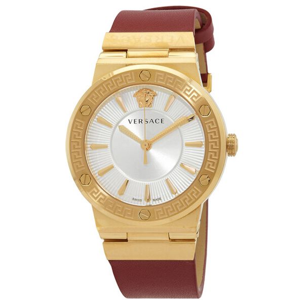 ساعة نسائية من فيرساتشي، تتميز بعـلبة 38 ملم من الفولاذ المقاوم للصدأ مطلية بالذهب وسوار جلدي أحمر، مع قرص فضي وعقارب ذهبية اللون وعلامات الساعة Index، وزخرفة شعار Medusa عند الساعة 12، تأتي الساعة بزجاج ياقوتي مقاوم للخدش، مقاومة للماء حتى 50 مترًا، ومزودة بإبزيم قابل للطي، تعمل الساعة بآلية كوارتز سويسرية