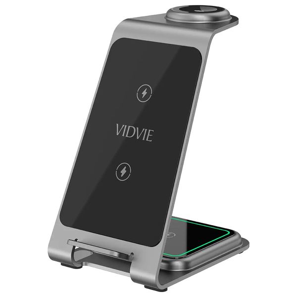 محطة شحن لاسلكية 3 في 1 من VIDVIE تصميم حامل يتيح شحن ثلاث أجهزة في آن واحد. تدعم حتى 15 واط شحن لاسلكي سريع مع ملفين للشحن وتتيح وضع الهاتف عموديًا أو أفقيًا، مع مناطق شحن مخصصة للساعات الذكية والسماعات اللاسلكية. مزودة بمنفذ Type-C ومؤشرات LED لعرض حالة الشحن مع اللون الأسود ليكمل ديكور المكتب العصري.